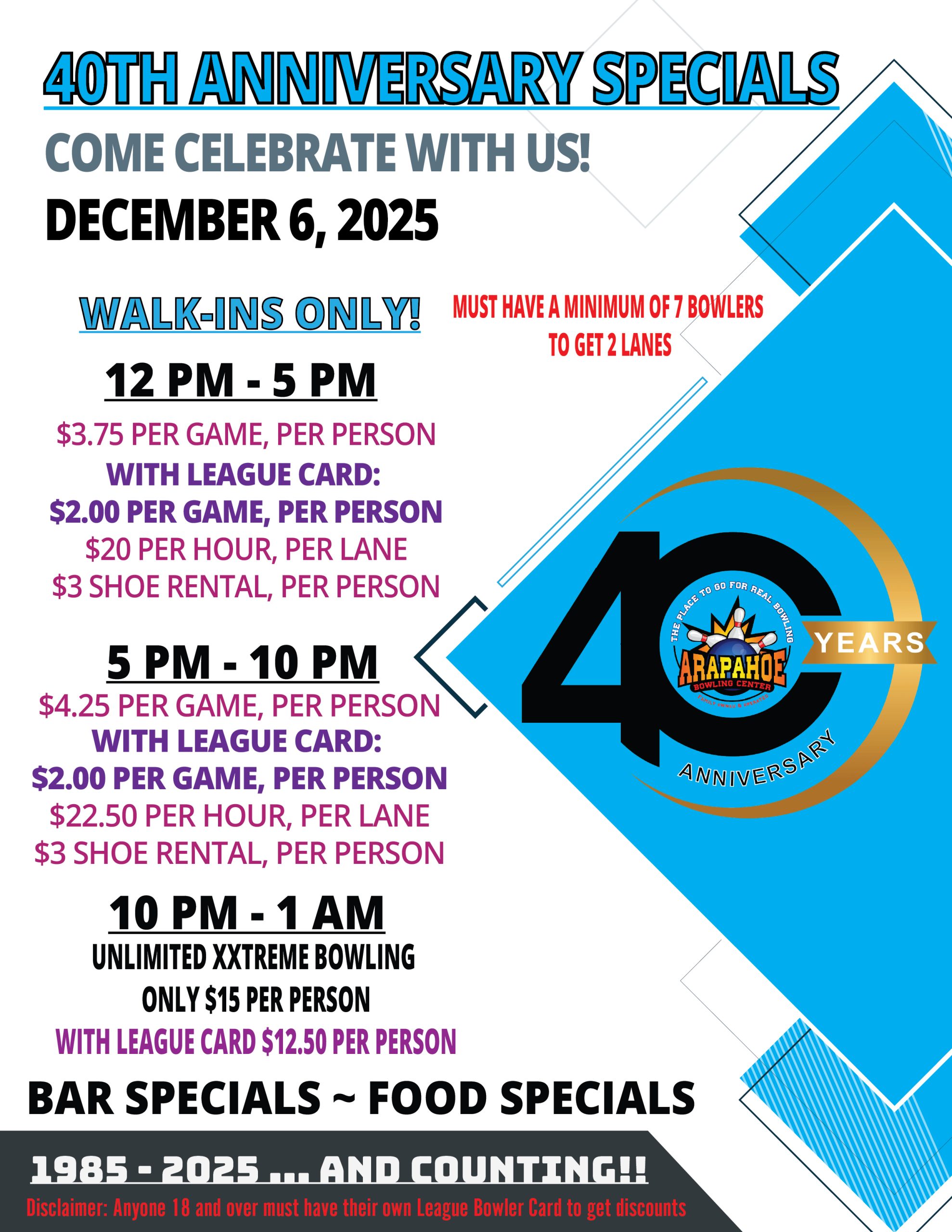 Started bowling there this summer on the Wednesday night trios. I’ve heard so much about Arapahoe and it’s all been great.. Let me tell you the staff there did not disappoint. Always friendly and great service. I’v decided to join a fall league as well. Thank you Arapahoe Bowling Center!!!!!
